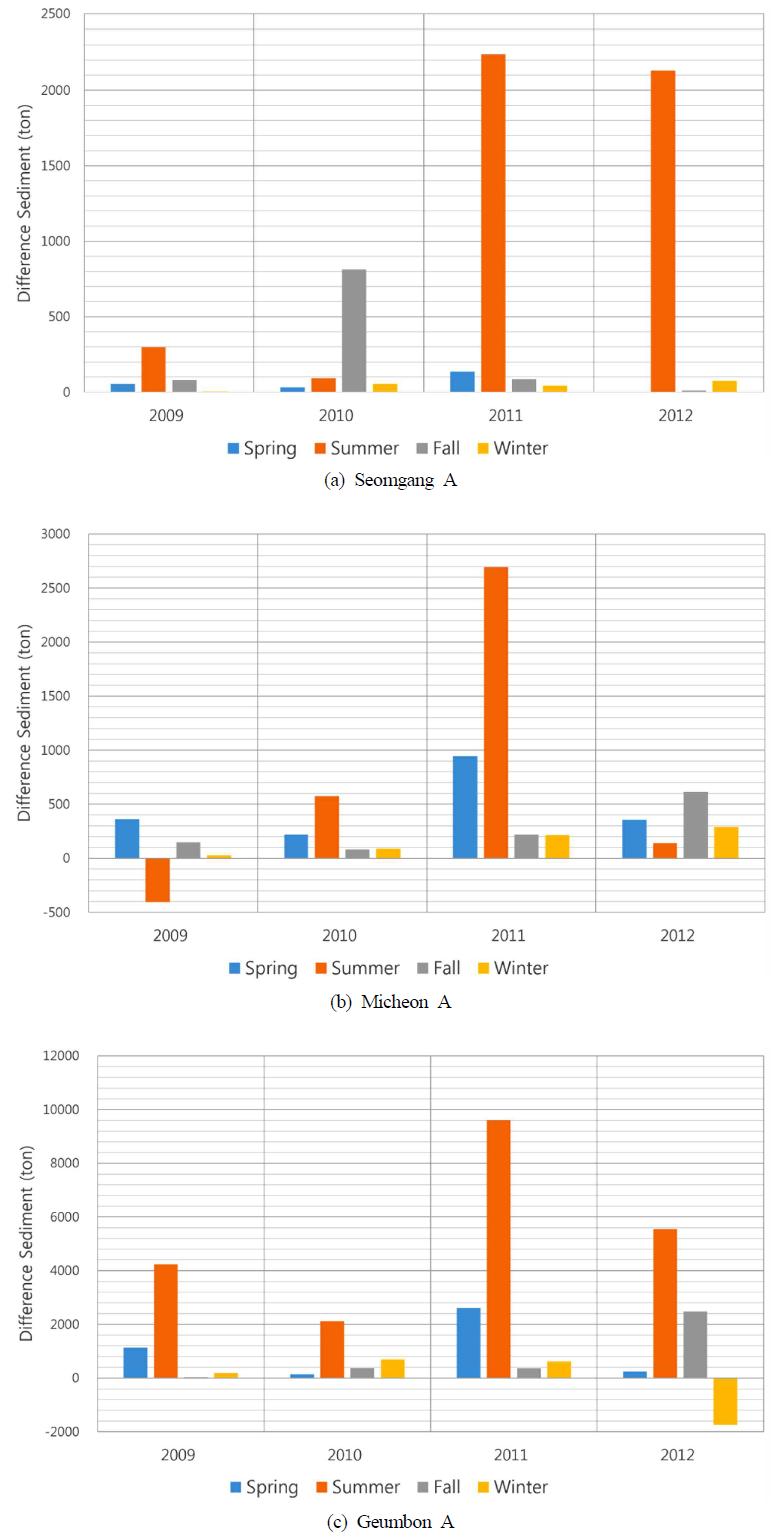 Table 8~10과 같이 각 유역의 연도별-계절별 SS 오염부하량 차이는 세 유역 모두 여름철에 대부분 가장 차이가 크게 났으며, 겨울철은 다른 계절에 비해 비교적