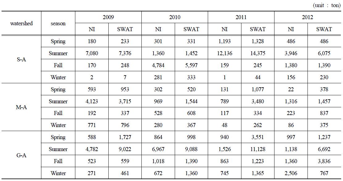 한계가 있으므로 다른 계절에 비해 여름철 SWAT 모형에서 산정된 SS 오염부하량과 NI방법으로 산정된 SS 오염부하량의 차이도 크게 나타나는 것으로