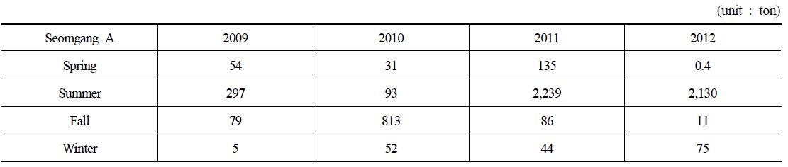 미천A 유역은 봄 357ton, 여름 142ton, 가을 614ton, 겨울 289ton이고, 금본A 유역은 봄 240ton, 여름 5,555ton,