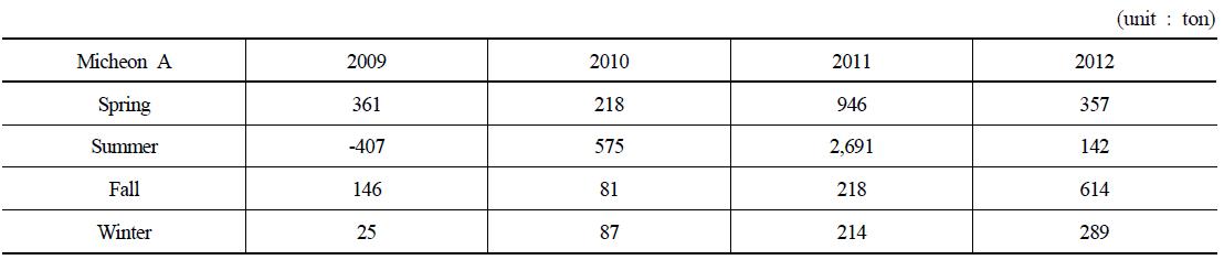 미천A 유역은 봄 361ton, 여름 -407ton, 가을 146ton, 겨울 25ton이고, 금본A 유역은 봄 1,140ton, 여름 4,240ton,