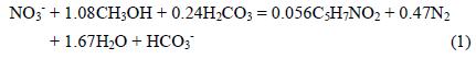 무산소 단계에서는 KNO3 주입을 통해 질산성 질소의 농도를 인위적으로 높여주었으며, Mandt and Bell (1982)이 제시한 식 (1)에 나타난 탈질반응 시 탄소원 소모를 유도하여 주정폐수 내 고농도 유기물을 제거하고자 하였다.