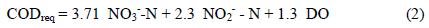 KNO3 주입량은 Manddt and Bell (1982)이 제시한 아래의 식 (2)에 의해 COD와 NO3--N의 생분해 관계식을 참고하여 산정하였으며, 아질산성 질소(NO2--N)와 DO의 영향은 무시하였다.