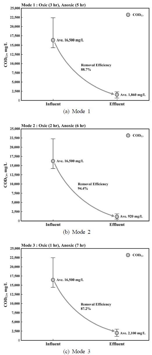 Anoxic 6 hr으로 운전주기를 설정하였을 경우 방류수의 평균 CODCr 농도는 920 mg/L로 94.4%의 가장 높은 유기물 제거효율을 보였으나, Influent (Oxic) 1 hr, Anoxic 7 hr에서는 87.2%로