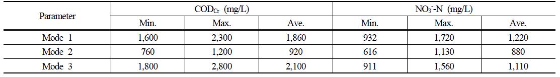 SBR 운전주기를 Influent (Oxic) 3 hr, Anoxic 5 hr으로 설정한 후 유기물 제거효율을 확인한 결과 방류수의 CODCr 농도는 1,600~2,300 mg/L 범위에서 평균 1,860 mg/L로 약 88.7%의 제거효율을 보였다. Influent (Oxic) 2 hr,