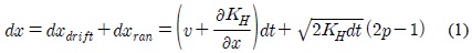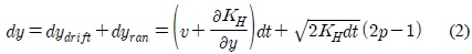 여기서, dx, dy는 직교좌표계, u, v는 x, y 방향으로의 유속, dt는 시간간격, KH는 수평확산계수이다.