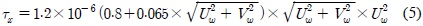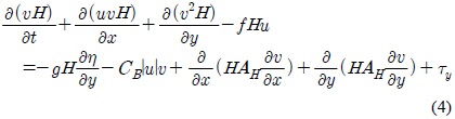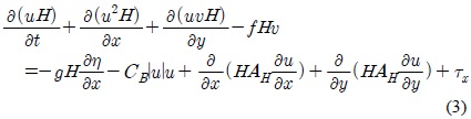 여기서, H는 전체 물기둥 깊이, f는 Coriolis 가속도, AH는 수평난류점성계수, g는 중력가속도, CB는 바닥 마찰계수, |u|는 유속 τx, τy는 x, y 방향의 바람응력, Uw, Vw는 수표면으로부터 10 m 높이에서의 x, y 방향 풍속이다.