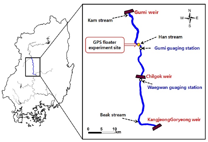있어(Seo et al., 2013), 낙동강 본류의 칠곡보 구간인 한천 합류부(Fig. 1)에서 GPS 부자 실험을 실시하였다.