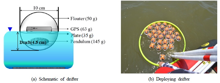 하천의 표면흐름에 따라 이동하는 GPS 부자는 Fig. 2(a)와 같이 지름 10 cm의 구체에 GPS 수신기와 부자의 흘수(draft)를 조절하기 위한 추를 넣어 제작하였다(Seo et al., 2013). GPS 수신기의 Chipset은 위치 정확도(Position accuracy)가 2.5 m 2D-RMS, 속도 정확도(Velocity accuracy)는