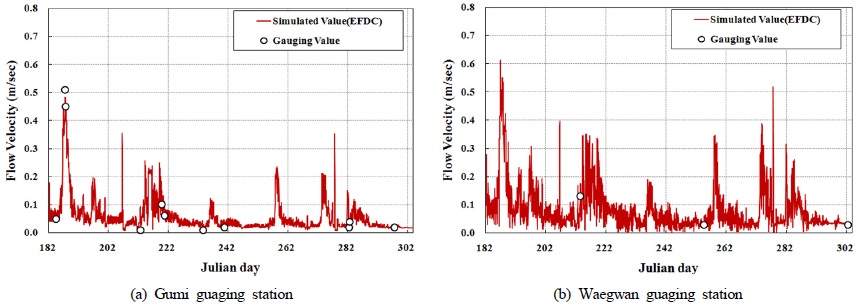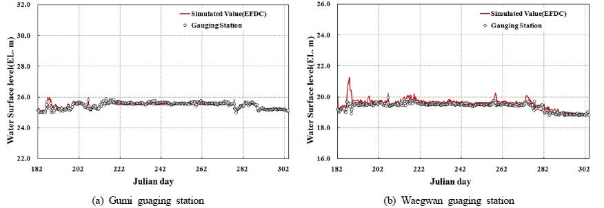 EFDC 모형의 하천 수리특성 재현성 검증을 위해 구미와 왜관 수위관측소의 관측자료와 비교한 결과, 유황에 따른 수위와 유속 변동을 적절히 모의하고