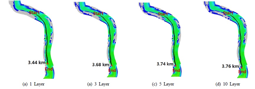 모형의 수층 수에 따른 영향을 파악하기 위하여 수평확산계수를 0.005 m2/sec로 고정하고, 평수기 유량 조건에서 입자의 이송 속도를 비교하였다(Fig. 5). 수층의 수를 1개, 2개, 3개, 5개, 10개로 변화시켰을 경우, 20시간 동안의 이송거리는 각각 3.44 km, 3.60 km, 3.68