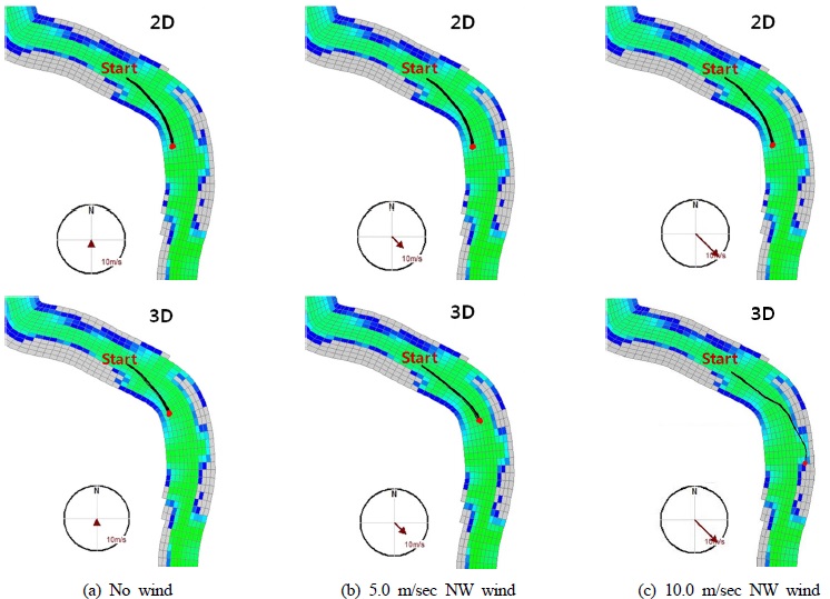 조건에서는 바람이 거의 없는 경우와 마찬가지로 지속적인 북서풍이 불 경우에도 입자의 이송속도나 경로가 거의 변경되는 않는 것으로 나타났으며(Fig. 7의 상), 약 35 m/sec 이상의 풍속에서 이송경로가 변경되는 것으로 확인되었다. 2차원 조건에서는 수심적분된 유속장에 의해서 입자의 이송이 계산되므로(TetraTech, Inc., 2007) 바람의 영향을 반영하기에는 한계가 있는 것으로 판단된다.