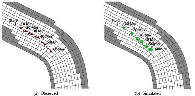 GPS 부자 실험결과와 GPS 부자 실험 당시의 수리조건으로 EFDC 라그랑지안 입자추적기법을 적용한 결과는 각각 Fig. 9(a) 및 (b)와 같다. 중심점 좌표를 기준으로 GPS 부자 실험에서는 1시간 동안 662 m 유하하였으며, 모의된 입자의 총 이송거리는 625