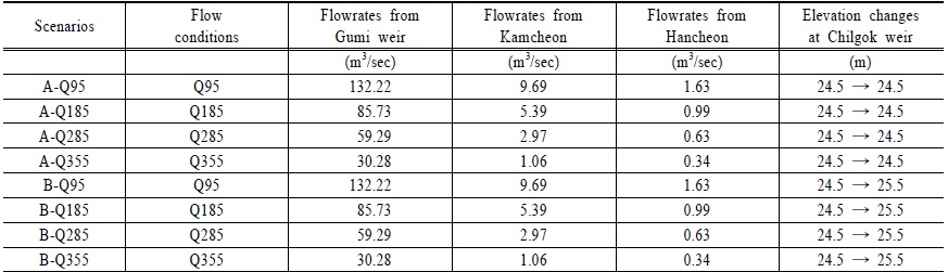 Q185, Q285, Q355)에서 칠곡보의 수위를 양수가능수위로 유지하는 것이고, 시나리오 B 그룹은 칠곡보의 수위를 양수가능수위보다 1 m 높게