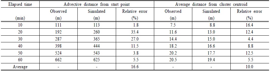 적용하여 입자의 이송거리와 확산분포에 대하여 GPS 부자 현장 실험결과와 비교·검증하였다.