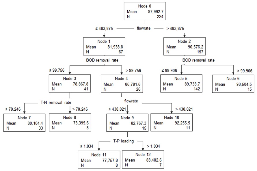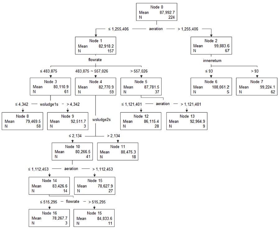 추출하기 위하여, 하수처리장의 운전변수와 유입수 부하 및 제거율이 에너지 소비량과 가지는 연관성에 대한 패턴을 의사결정나무분석을 통하여 추출하였다.