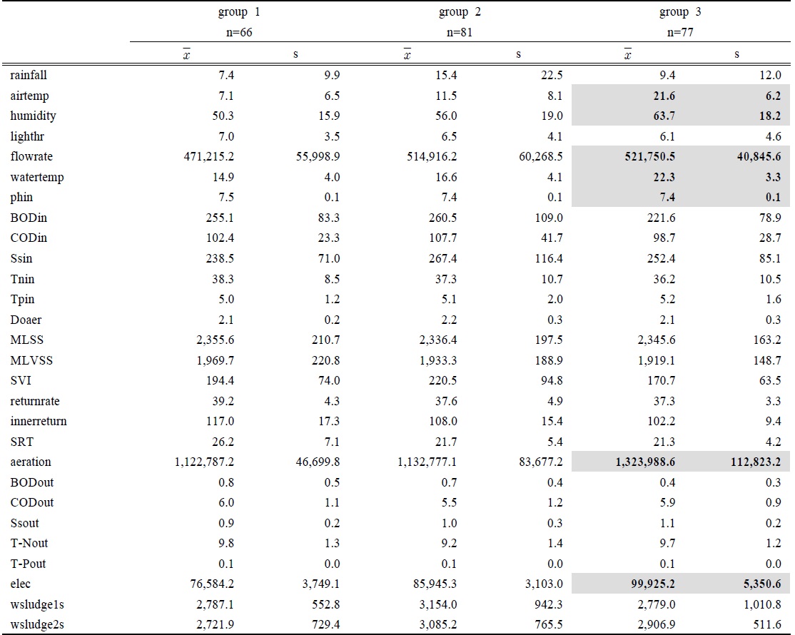 대하여 K-평균 군집 분석을 수행하고 에너지 소비량의 각 그룹의 소속에 따라 나머지 운영인자 및 환경변수들에도 그룹을 할당한 후 분산분석을 통하여