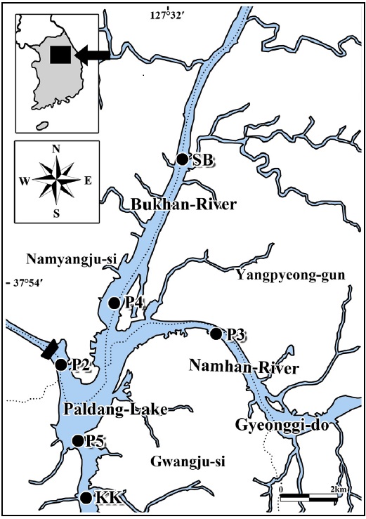 (SB, P4) Namhan-River (P3), Lake Paldang (P2, P5) and Kyeongan-Stream (KK)