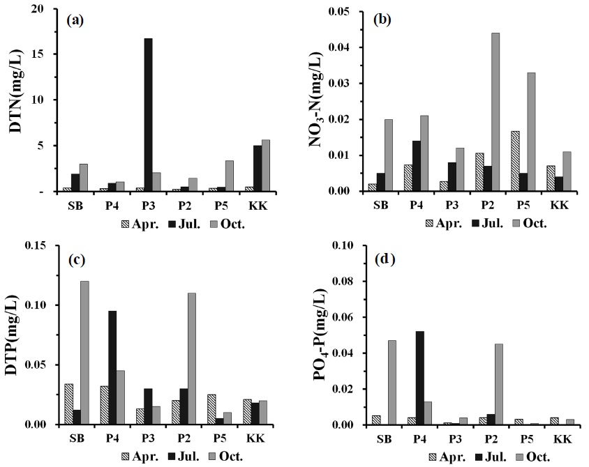 농도가 낮았으며, 이는 퇴적층에서 수층으로 용출되는 속도와 관련이 있을 것으로 판단된다(Lee et al., 2009). 다른 지점에 비해 DTN의 농도가 매우 높았던 P3는 반대로 DTP와 PO4-P의 농도가 낮게 나타났으며, P4의 경우 7월에 다른 지점에 비해 DTP와 PO4-P의 농도가 높았다(Fig. 4).