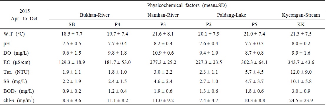 Paldang-Lake (P2, P5) and Kyeongan-Stream (KK) from Apr. to Oct. in 2015