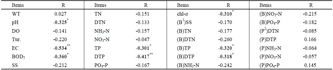 Correlation coefficients benthic cyanobacteria and items of water quality Bukhan-River