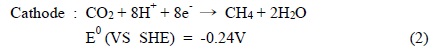 박테리아가 유기물을 분해하며 전자를 방출하고(식 (1)), 방출된 전자는 환원전극에서 (식 (2), (3))의 전기화학반응을 통해 수소 및 메탄을