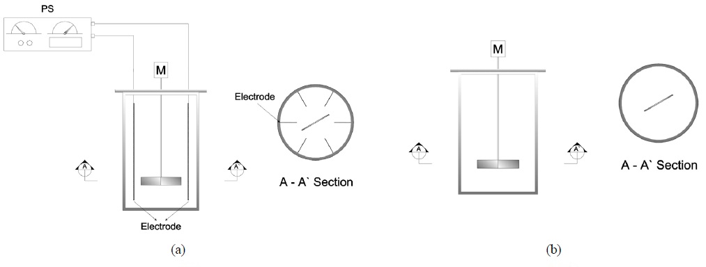 고정을 위해 아크릴틀을 제작하여 Fig. 1의 (a)와 같이 반응조내 배치하여 실험을 진행하였으며, 완전혼합을 위하여 교반기(Agitation speed, 100 rpm)를 설치하였다. Fig. 2와 같이 MET 반응의 중요한 운전인자인 내부저항을 최소화하기 위해 전극간격을 최소화하였으며, 산화전극과 환원전극의 직접적인 접촉으로 인한 단락현상을