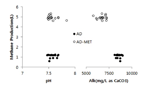 값이 0.4 이하일 때 충분한 완충력을 가진다고 보고되어 있다(Zhao and Kugel, 1996). 본 연구에서 안정화 기간AD와 AD-MET에서 r값이 각각 0.26, 0.32로 나타나 완충력이 충분하여 안정적으로 운전되고 있다고 보여진다(Fig. 5). 하지만 AD-MET에서 AD보다 알칼리도가 감소한 원인에 대해서는 추가적인 연구가 필요할 것으로 사료된다.