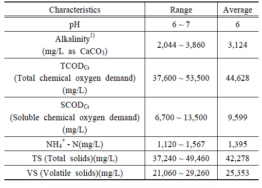 본 연구에서는 고온‧고압(165℃, 7.5 kg/cm2)에서 전처리한 혼합슬러지(생슬러지-1차 침전지에서 침전후 발생슬러지: 잉여슬러지-2차침전지에 침전된 슬러지, 4:1)를 사용하였으며 그 성상은 Table 1에 제시된 바와 같다.