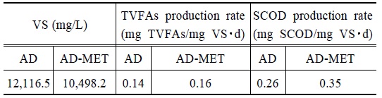 또한, 안정화기간 AD-MET에서 TVFAs와 SCOD의 생성속도는 AD보다 각각 12%, 35% 향상되었지만(Table 2), Table 4에서와 같이 반응조내 잔류 TVFAs의 농도는 AD와 AD-MET에서 1,702.0 mg/L와 1,666.4 mg/L로 비슷하였다(Table 3). 이는 AD-MET에서 TVFAs의 메탄 전환이 AD보다 크다는 것을 의미하며, Zhao et al. (2014)의 연구에서 MET 반응이 VFAs의 제어에 유리하며 메탄생성의 전환율을 높일 수 있다는 연구결과와 일치한다(Zhao et al., 2014). 결과적으로 VFAs의 메탄전환에 의해 Fig. 3에서 나타낸 메탄생성량의 차이가 발생했다고 사료된다.