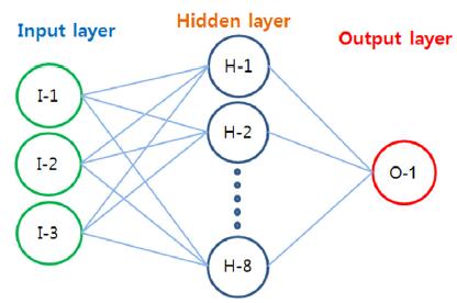 발전하였다. 다층퍼셉트론은 여러 개의 처리소자를 각 계층에 모형을 구성한 것으로서 Fig. 1과 같이 입력자료를 받아들이는 입력층(input layer), 결과를 나타내는 출력층(output layer)으로 구성되며 두 개의 층 사이에는 중간층(hidden
