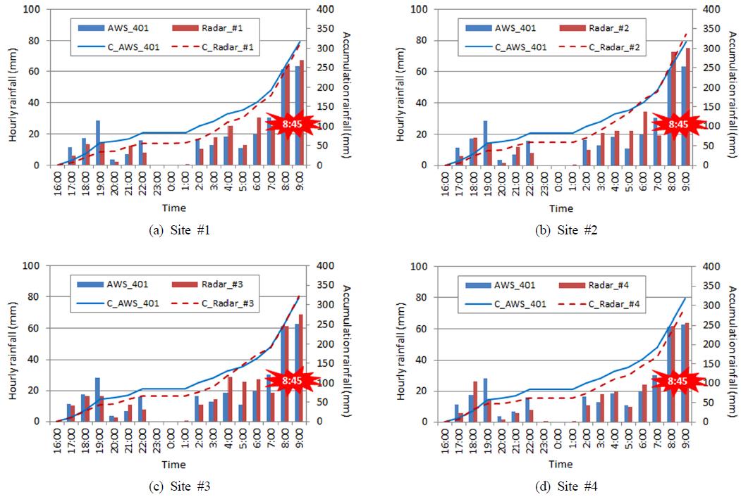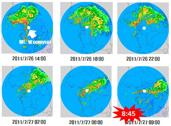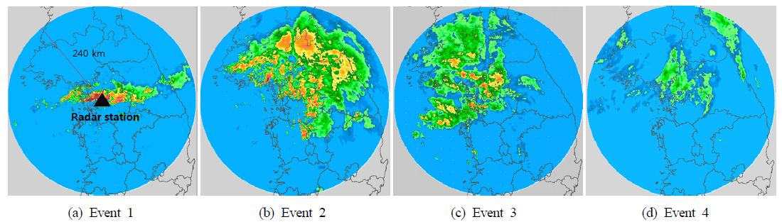 위의 지점관측 자료와 더불어 수도권 지역을 가장 잘 대표하고 있다고 판단되는 관악산 기상레이더(관측반경 240 km, 공간해상도 1 km, 시간해상도