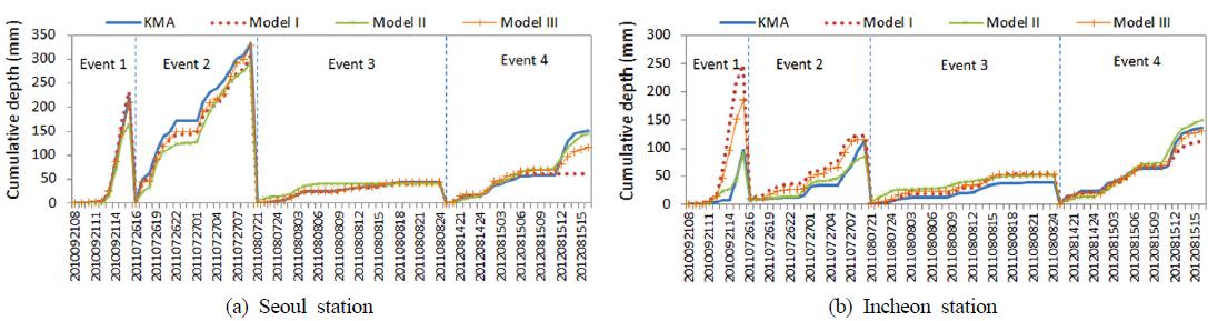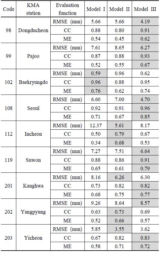 각 모형을 평가하는 방법론을 활용하였다. 따라서 각 모형을 KMA 지점을 대상으로 적용하여 강우량을 모의한 후 실제 KMA 지점의 강우량과 비교함으로써