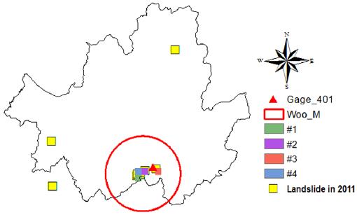 본 연구에서는 이러한 문제를 극복하기 위하여 AWS 보다 관측소의 밀도가 낮은 유인 기상관측소 지점(KMA 지점)을 토석류의 발생 지점으로 가정하고