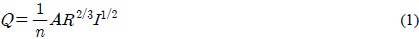 일반적인 관로에 대한 모델로 식 (1)과 같은 Manning 방정식을 사용한다. 식에서 n은 Manning 조도계수, Q는 유량(m3/s), A는 유수의 단면적(m2), R은 경심(m), I 는 동수경사를 나타낸다(KWWA, 2011). 하수도시설기준(2011)에서는 플라스틱관에 해당하는 n값을 0.011~0.015로 제안한다.