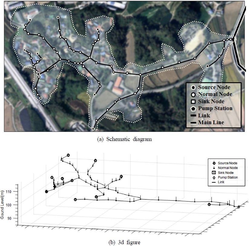 68개의 맨홀(Node) 1개의 펌프스테이션으로 구성되었다. 아래의 Fig. 1(a)는 B지역의 간락한 모식도이며, Fig. 1(b)는 (a)를 3차원으로 나타내어 Node 및 Link의 지반고를 표시한 그림이다. Node는 점으로 Link는 선으로 표시하였다.