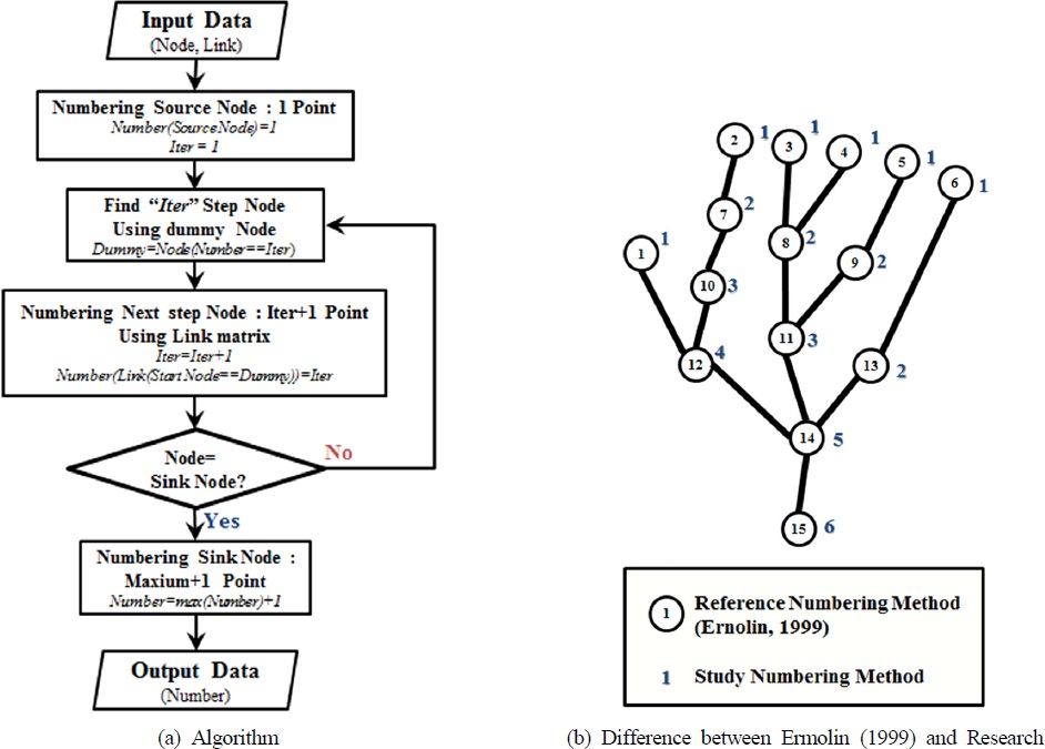위치 정보가 기입된 하수도 대장 및 설계 DB를 활용하여 네트워크를 구성하는 개별 관로의 수리특성 검토 순서를 할당한다. 마지막으로 3) 관로 수리