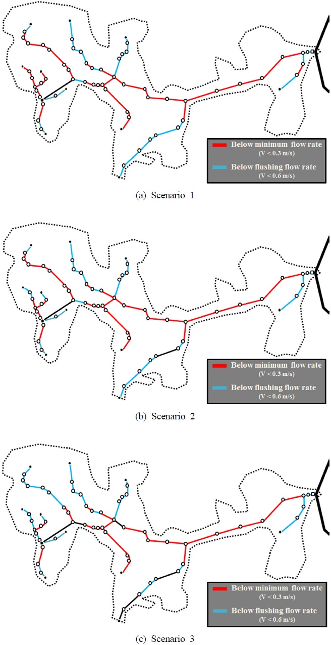 오수관로 네트워크의 유속에 대한 검토 결과 상류지역에 해당하는 설계 지역은 모든 시나리오 대해 대부분의 관로가 시설기준에서 언급하는 최저유속 기준인