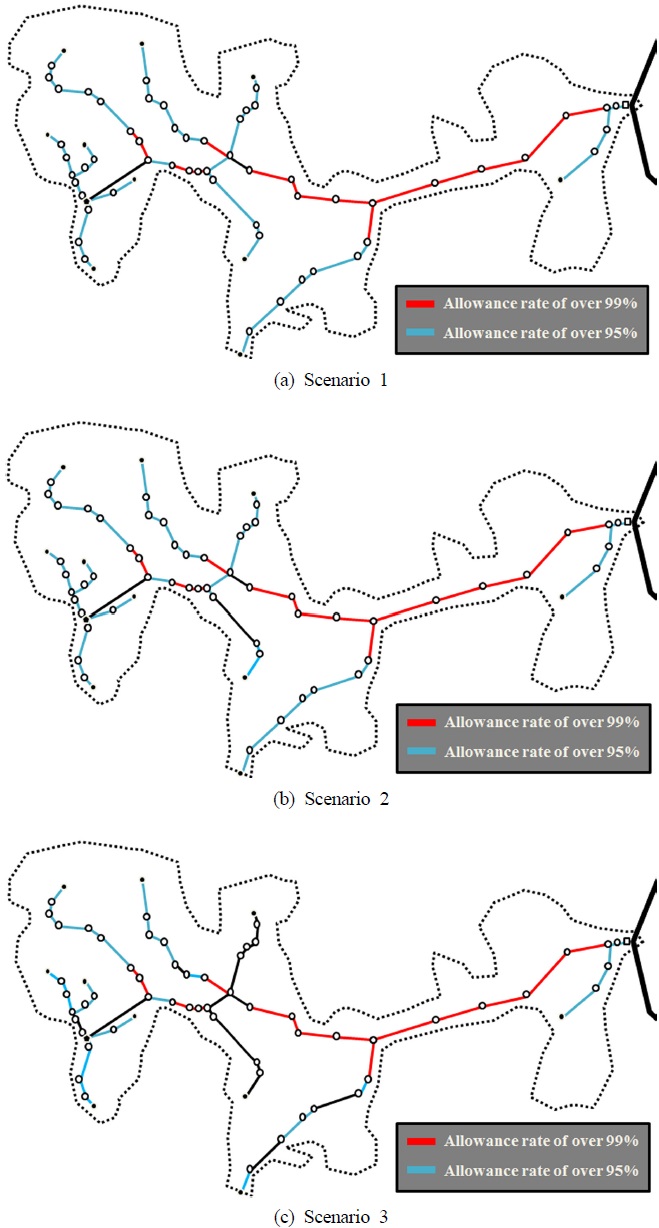 네트워크의 여유율에 대한 검토 결과 25%에 육박하는 관로들이 모든 시나리오에서 99%이상의 여유율을 가지고 있다. 이는 현재 하수도 시설 기준에서