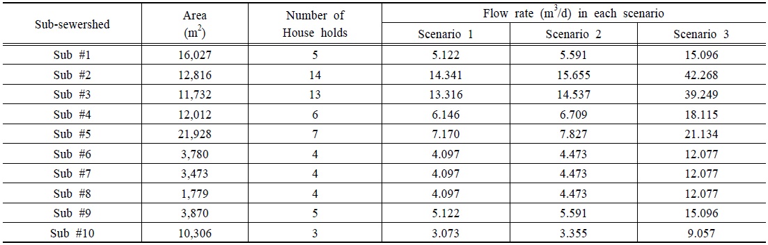 생활 오수량의 10%)를 사용하였다(Anseong, 2010). 시나리오 1은 설계 기준인 계획 시간 최대 오수량 원단위만 고려한 경우, 시나리오 2는 원단위에 지하수량을 포함한 경우, 시나리오 3은 RDII량을