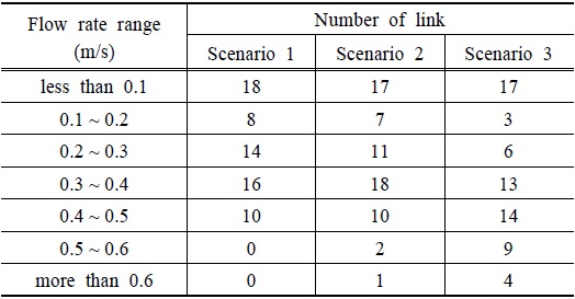 Table 2는 관로를 시나리오에 따라 유속별로 분류한 표이다. 처리구역 상류 지역에 대한 유속에 대한 명확한 기준은 존재하지 않으나, 설계에서는 분류식 하수관거에서