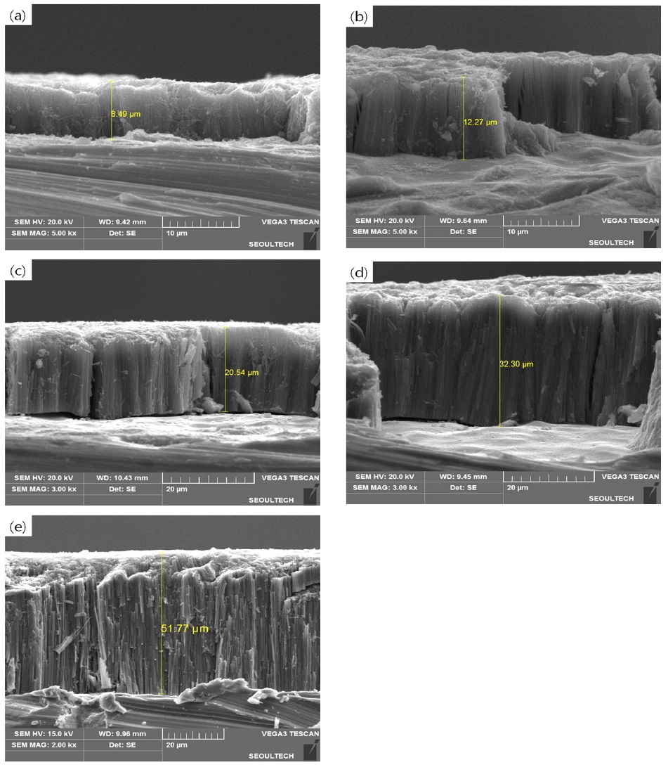 Fig. 5와 같이 TiO2 nanotube plate의 표면은 인가전압에 차이에 의해 변화는 미비한 것으로 나타났다. Fig. 6에서 나타나듯 인가전압이 높아질수록 TiO2 nanotube의 길이는 길어지는 것을 알 수 있었다. 이를 통해 인가전압이 높아질수록 TiO2 nanotube의 길이는 길어지는 것을 알 수 있는 데 이는 인가해주는 전압이 증가할수록 전기적 활성 에너지가 높아짐으로써 양극에서의 전자를 잃는
