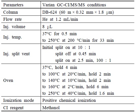CI)방법으로 이온화 시키는 GC-CI/MS/MS로 분석하는 시험법이다. 이전 연구자들은 전자이온화(Electron Ionization, EI)법으로