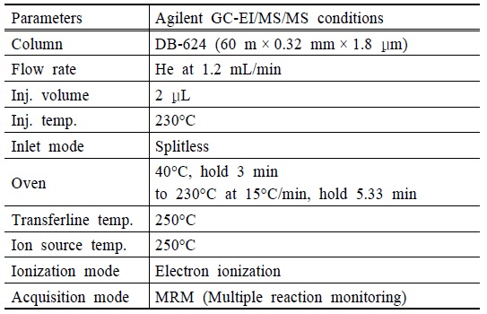 GC와 triple quadrupole 질량 분석기인 Agilent 7000C를 사용하였다. 목적성분들은 Agilent사의 DB-624 컬럼을 사용하여