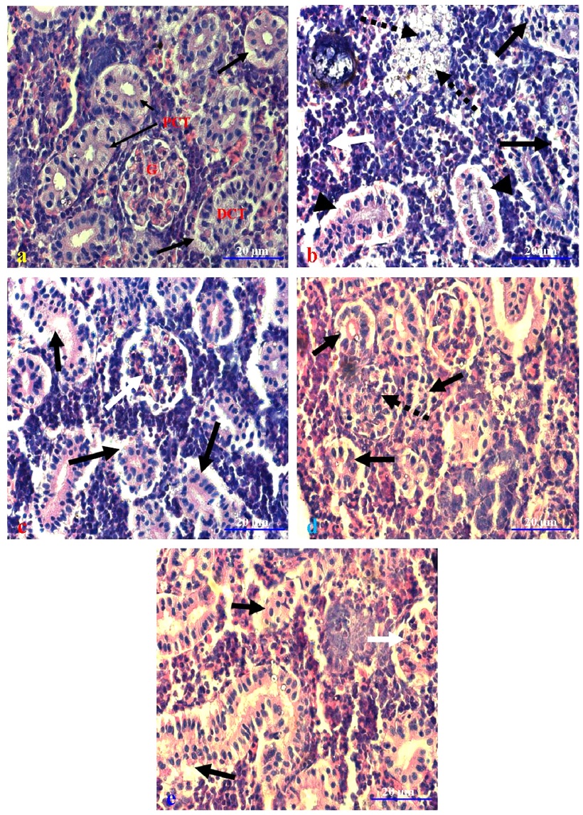 damage (black arrow) and proliferated glomerulus (broken arrow); and (e) a downstream