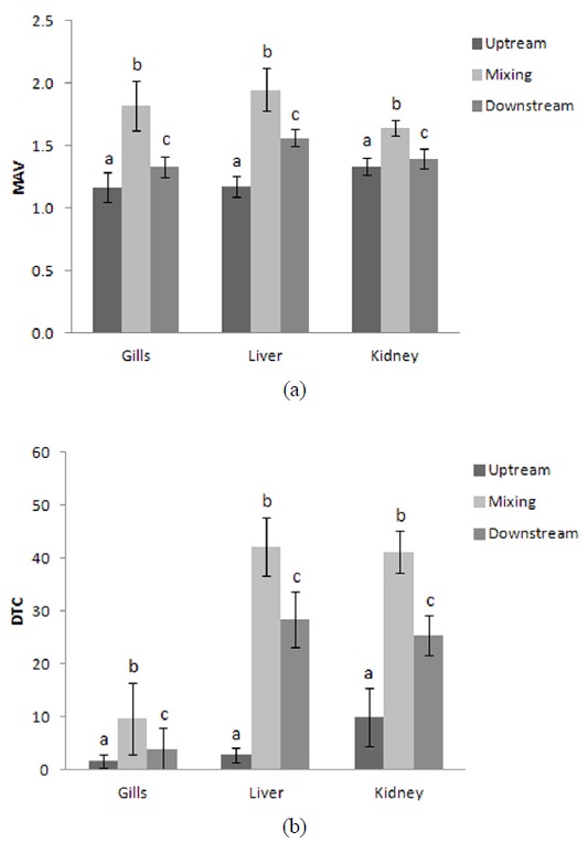 in samples from the mixing zone than in those from the downstream site (Fig. 4 and Table 1). As indicated in Fig. 5, the MAV and DTC in kidneys were significantly higher in fish collected from the