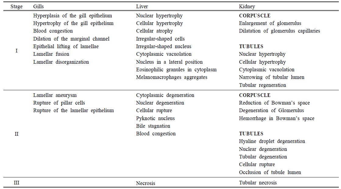 Histopathological alterations observed in the gills, liver, and kidney of the C. auratus in the present study indicate that fish were responding to the direct effects of