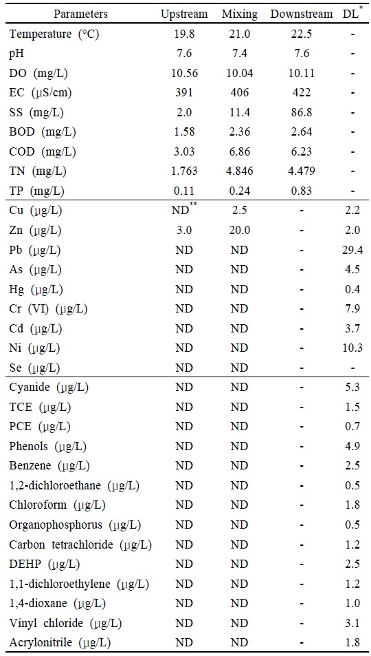 substantially higher in the mixing zone than in the upstream site. Yoo et al. (2013) demonstrated that concentrations of Cu and Zn (1.2-21 and 1.53-1668 μg/L, respectively)