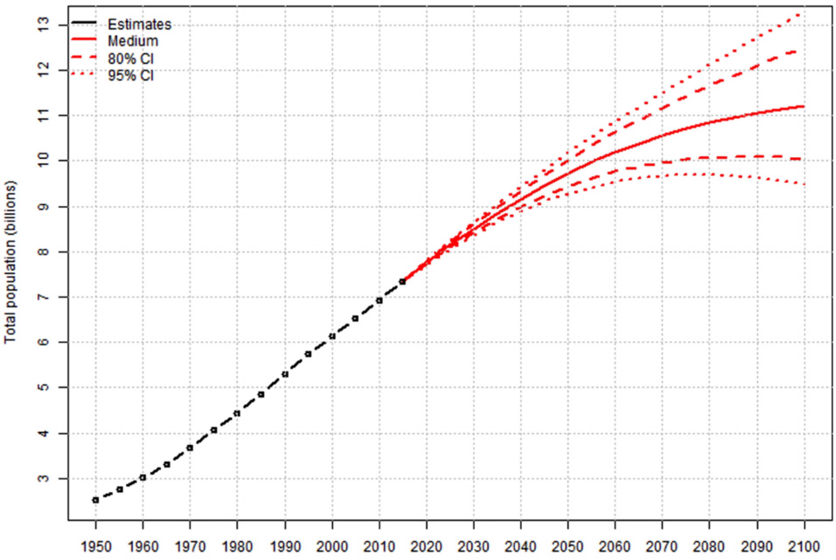 Fig. 1. Projection of population of the world (1950-2015: estimates; 2015~2100: medium-variant projection and 80 and 85 percent confidence intervals) (United Nations (2015)).