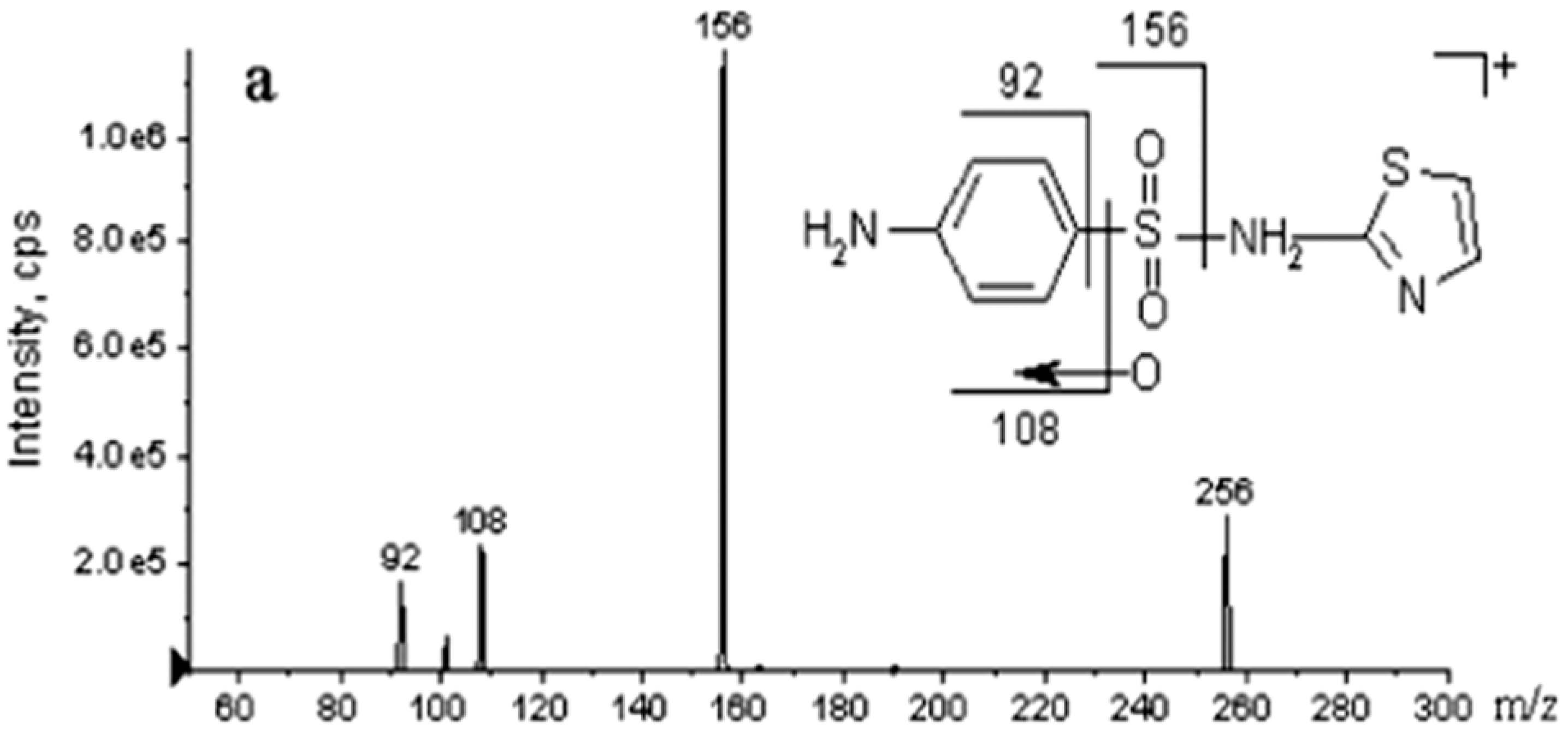 Fig. 2. Tandem mass spectrum of sulfathiazole and collisioninduced dissociation mass fragmentation (Hao et al. (2006))