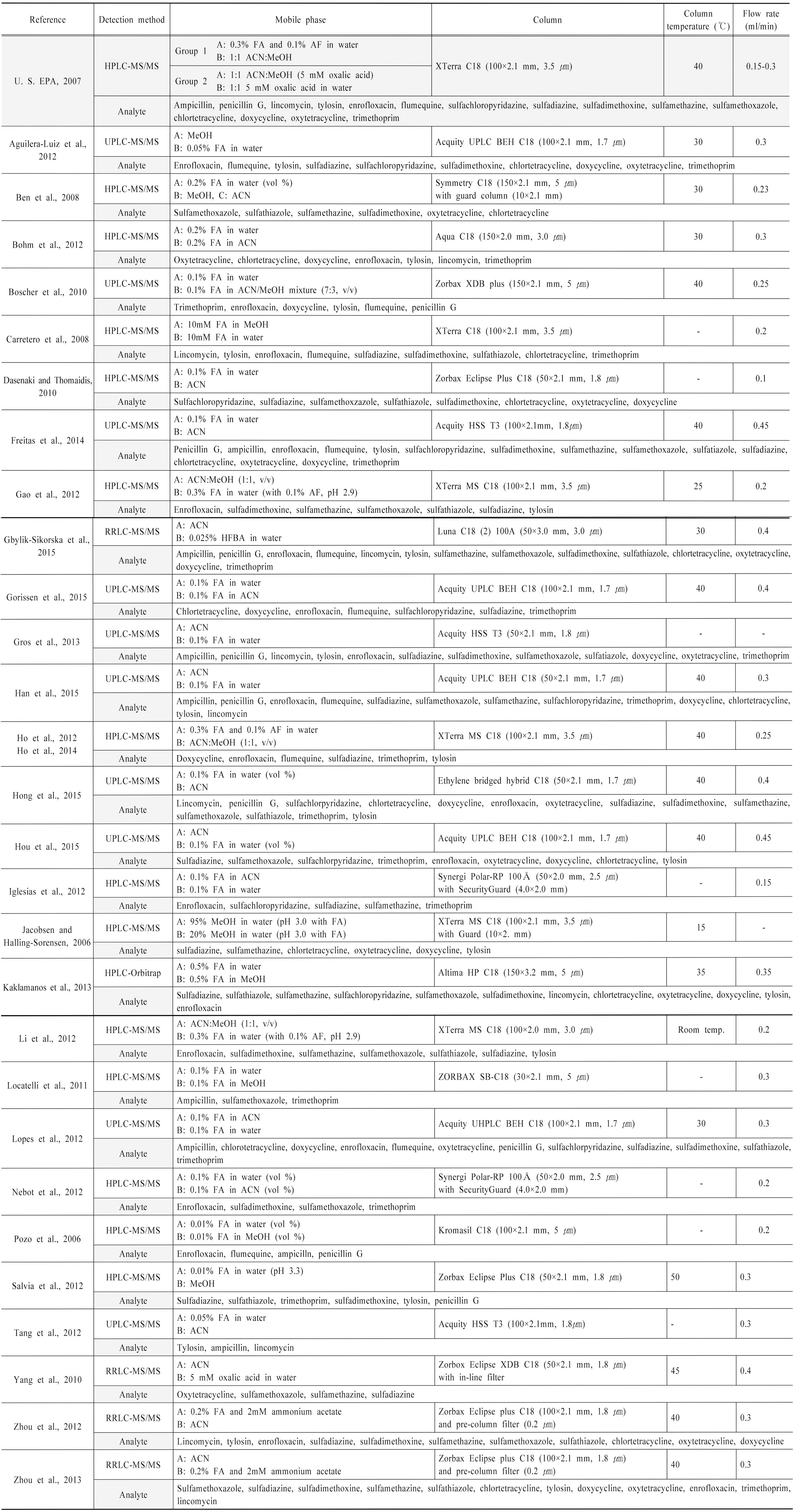 EPA method 1694는 액체, 고체 시료중의 잔류 항생제 농도 를 분석하는데 HPLC-MS/MS를 사용하였고 HPLC와 MS/MS 각각에 대한 분석조건을 제시하고 있다(U. S. EPA, 2007). 따 라서 본 연구에서는 LC와 MS를 사용하여 항생제를 분석한 문헌들로부터 분석방법을 조사하였다. LC 분석조건으로 컬 럼의 종류와 온도, 이동상의 종류와 유량 등을 조사하였고 공통적으로 나타나는 특성을 확인해 보고자 하였다. 질량분 석기 조건으로는 대상 항생물질에 따른 이온화 방식, 전구이 온(precursor ion)과 전이체(transitions)의 질량 대 전하 비 (mass to charge ratio, m/z), 전구이온을 분해하기 위해 가하 는 충돌에너지(collision energy)량을 조사하였다.